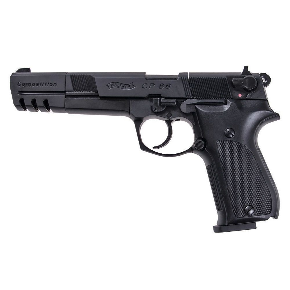 The Walther CP88 CO2 Air Pistol replica is ideally suited for “Action Shooting Target Games”. The outstanding workmanship and the simplified modular system help make this an outstanding choice for both experienced and novice shooters. A replica in looks and weight, the CP88 is an economical choice for owners of similar firearms. An air pistol with quality craftsmanship like this Walther is perfect for muscle retention and sharp shooting. Comes in a foam-lined plastic gun case and includes two 8-shot rotary magazines.