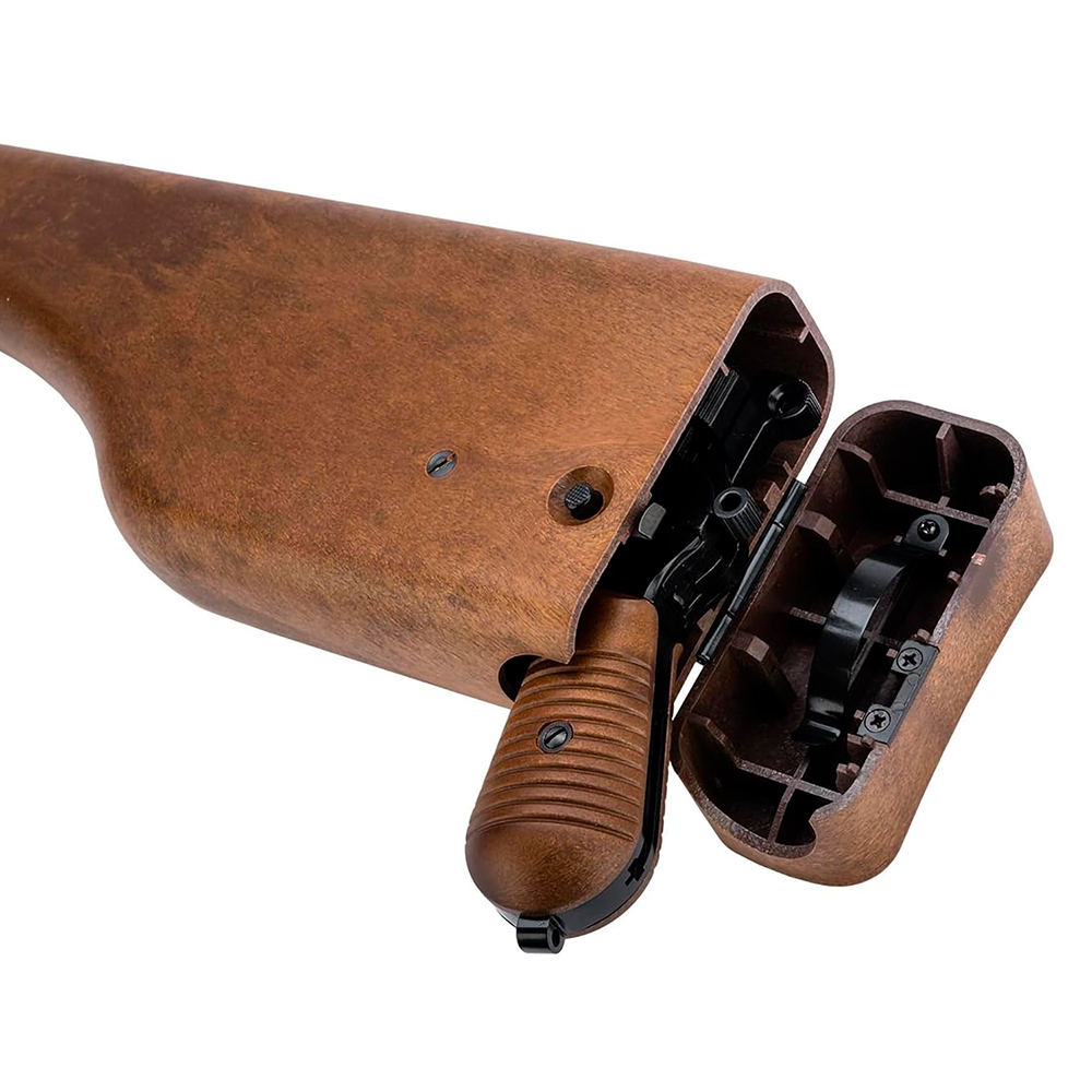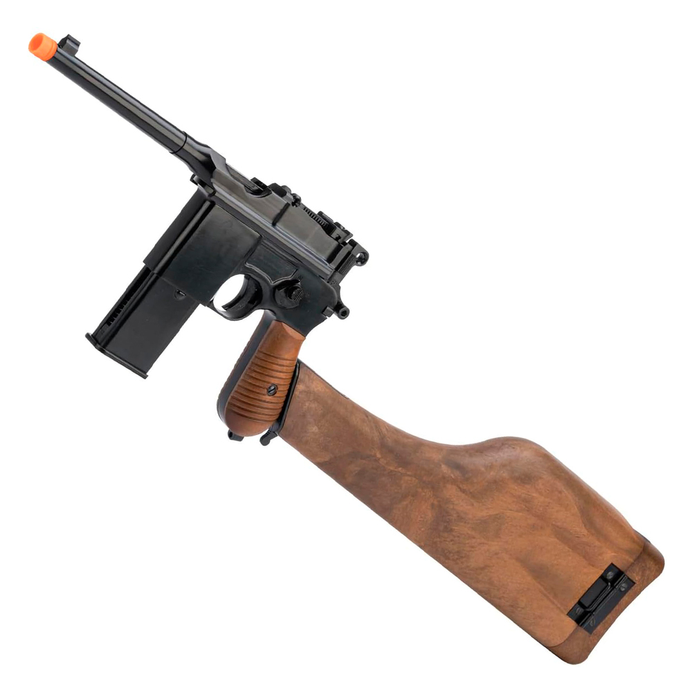 The Mauser-style detachable stock, made from realistic imitation wood and injection-molded polymer, not only enhances the pistol’s appearance but also functions as an iconic holster. The adjustable rear leaf sight aids in precise targeting, making this airsoft pistol a reliable choice for enthusiasts.
