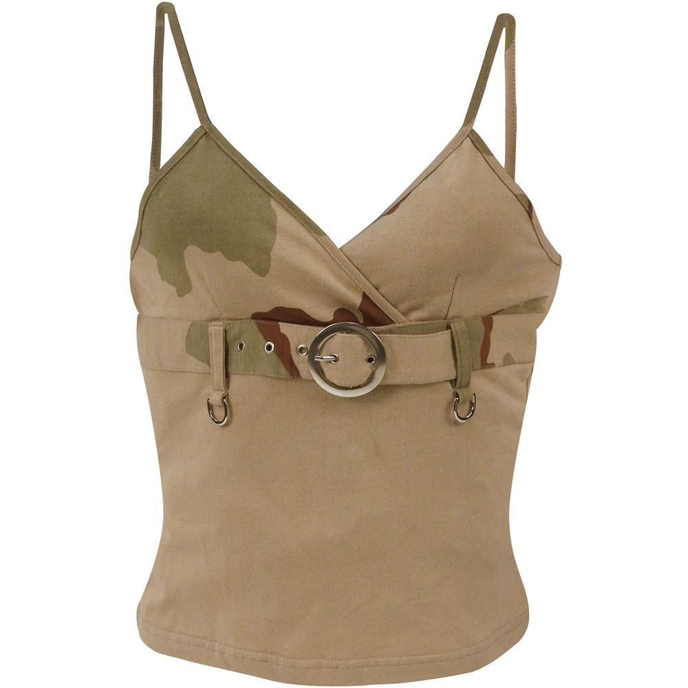 This is a very comfortable tank top, ideal for warmer times. Because it is made of cotton, it offers great comfort. Although the design is very trendy, the wear is quite durable, thanks to the strong material used. There is a smart belt with buckle around the chest, along with two rings in the front, which adds to the look. The top is attached to the shoulders through straps. This spaghetti strap top primarily has a tan color, but there are also splashes of olive drab and brown on it. Together they lend it that perfect ‘camo’ look.