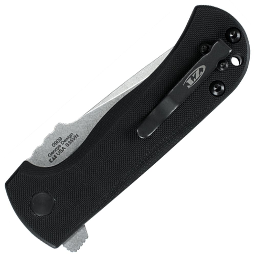 The handle is built of 3D-machined G-10, contoured for sure grip. Strong, lightweight, and resistant to temperature changes, this material makes an ideal knife handle. To back the G-10 scales, ZT added extra-thick liners—like the ones found in our classic 0350 series. The beefy liners make the 0909 extremely stable and rigid, as well as providing a secure liner lock that holds the blade safely open during use. Finally, a reversible, deep-carry pocketclip allows the knife to ride comfortably low in the pocket for convenient everyday carry.