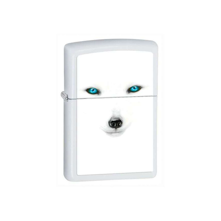 A nature theme Zippo Lighter with Arctic Fox White Matte finish and design. This model has the following design elements: Cats, Dogs, Wolves & Horses, Standard Size case, white in colour. This Zippo features a Powdercoat matte white finish. This lighter i