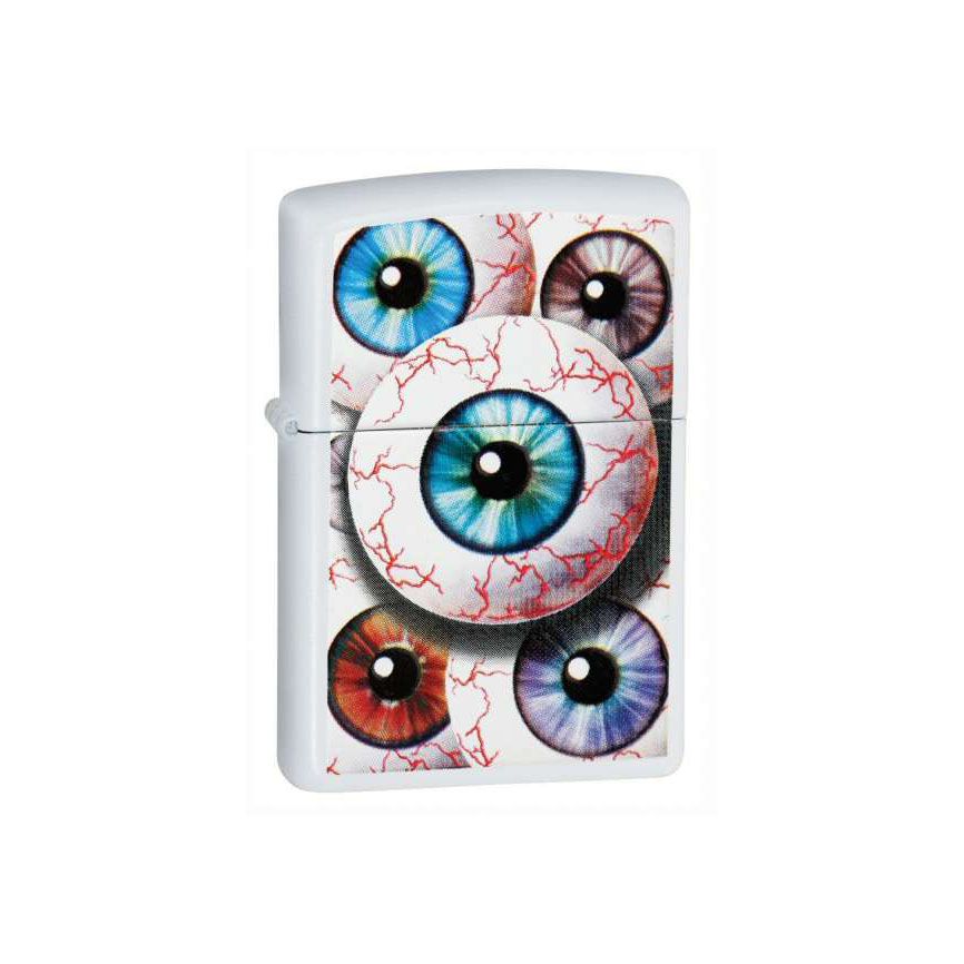 A miscellaneous theme Zippo Lighter with Eyeball White Matte finish and design. This model has the following design elements: Miscellaneous, Standard Size case, White in colour. This Zippo features a Powdercoat Matte White finish. This lighter is fluid fu