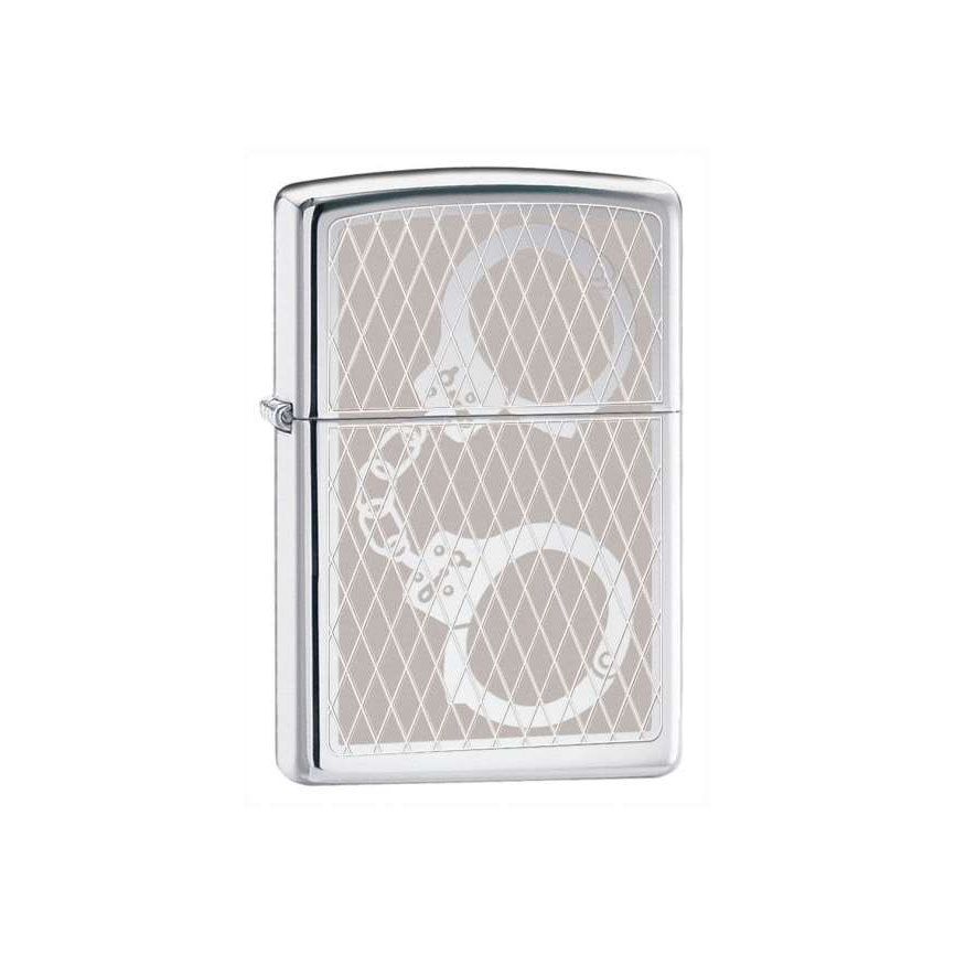 A military and services theme Zippo Lighter with Handcuffs Bling High Polished Chrome finish and design. This model has the following design elements: Military & other Services, Miscellaneous, Standard Size case, chrome in colour. This Zippo features a Ba