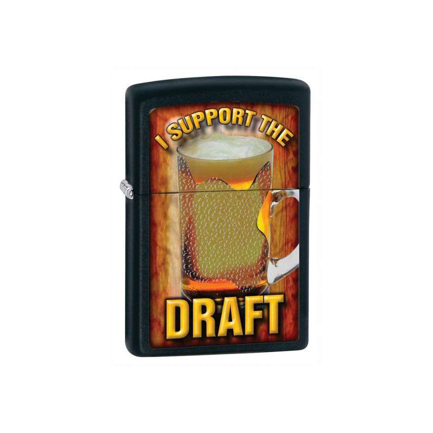 A alcohol theme Zippo Lighter with I Support The Draft Black Matte finish and design. This model has the following design elements: Alcohol & Drinking, Text and Statements, Standard Size case, black in colour. This Zippo features a Powdercoat matte black